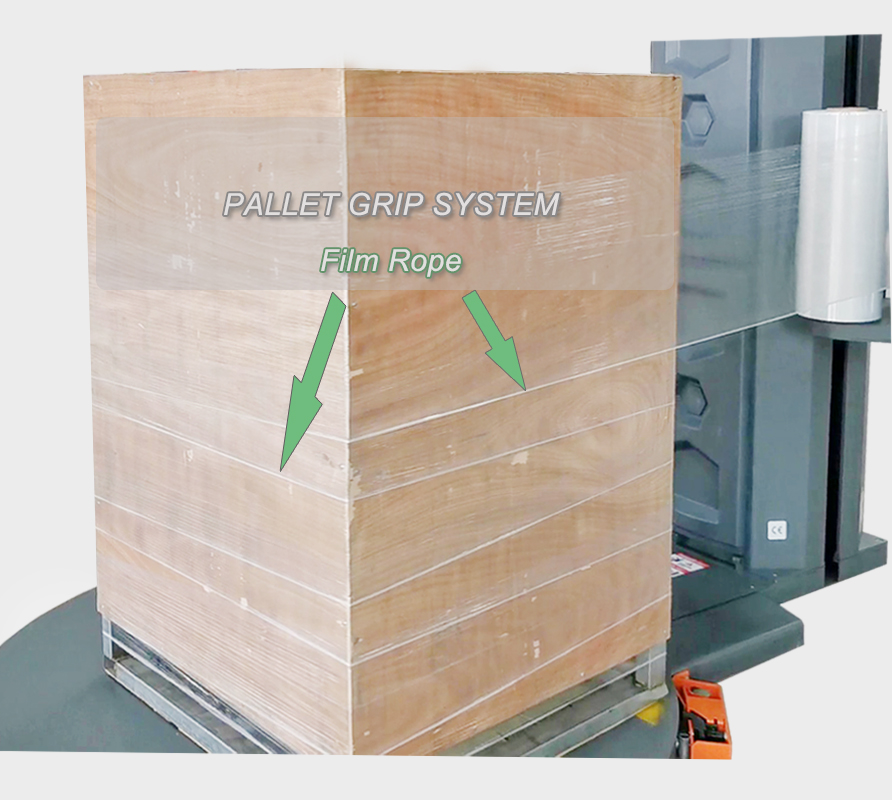 The film forms a rope that secures the pallet base and load tightly — preventing movement during transport and replacing the need for strapping.